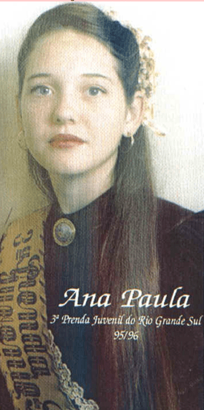 Mensagem: O Concurso Estadual de Prendas representou não só uma conquista pessoal para nós, como também e, principalmente, o início de uma longa e intensa amizade! Gostaríamos de dividir essa alegria… Tudo começou por fazermos parte do mesmo CTG “Sinuelo da Serra” em Serafina Corrêa, no ano de 1994. A Rafaela Lora Franceschetto estava deixando o cargo de 3ª Prenda Juvenil do RS e eu havia conquistado o título de 1ª Prenda Mirim do CTG Sinuelo da Serra. A partir disso, buscando um bom desempenho nos Concursos Regional e Estadual, intensificamos nosso contato. Muitas pesquisas, resumos, idéias, cansaço e angústia dividiram nossa rotina escolar, familiar e os compromissos com o próprio CTG. A preocupação objetiva e até então específica, tomou proporções inesperadas e surpreendentes. Aqui estamos nós, nove anos depois, mais velhas, com experiências de vida diferentes, residindo em estados diferentes, eu no RS e Rafaela em SP e no entanto… ainda colhendo o carinho, respeito e amizade plantados nesta época de criança e adolescente. Com muito prazer e orgulho, além da experiência vivida no e pelo Movimento Tradicionalista Gaúcho, compartilhamos os frutos deste período em dois sacramentos: da crisma e do matrimônio. Somos madrinhas uma da outra.